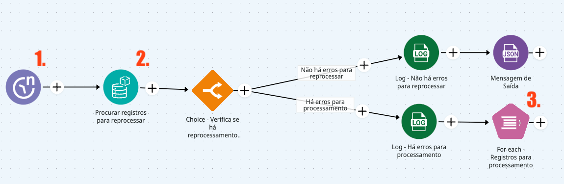 3. **Iterar registros da consulta**: Um conector de loop, como o [**For Each**](https://app.gitbook.com/s/SKBJ6ZiEWBU93x170HH4/connectors/logic/for-each), para iterar por cada registro recuperado. Dentro do **Subfluxo OnProcess**, o primeiro passo é incrementar o contador de tentativas para rastrear o número de reprocessamentos realizados para o registro.