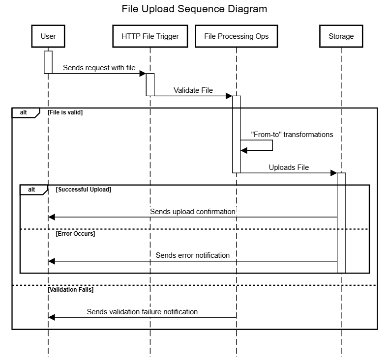 The diagram below provides a high-level overview of an implementation process for uploading a file to storage after enrichments and transformations. You can design your pipeline to accommodate the operations needed, as each integration scenario presents a unique use case.