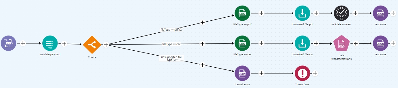 Route the pipeline according to file format: Use the Choice connector to route the flow to the appropriate branch based on the file type specified.