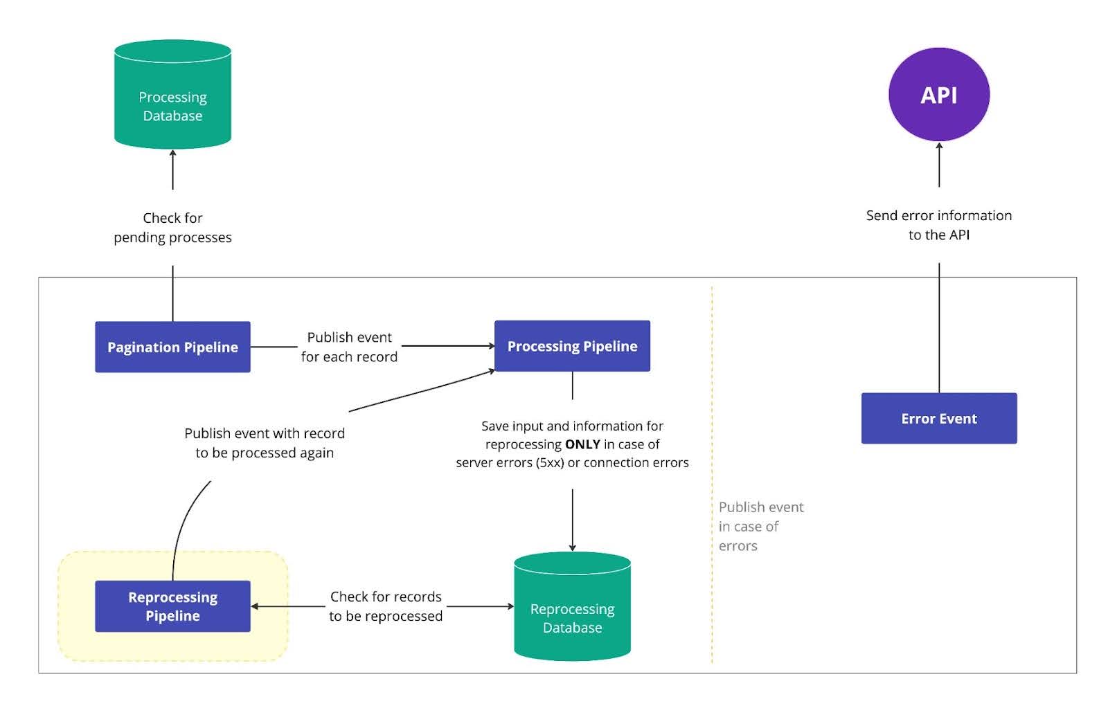 2. **Retrieving failed events**: At each interval, the pipeline checks a temporary database for records that couldn’t be processed by the processing pipeline and prepares them for reattempt.