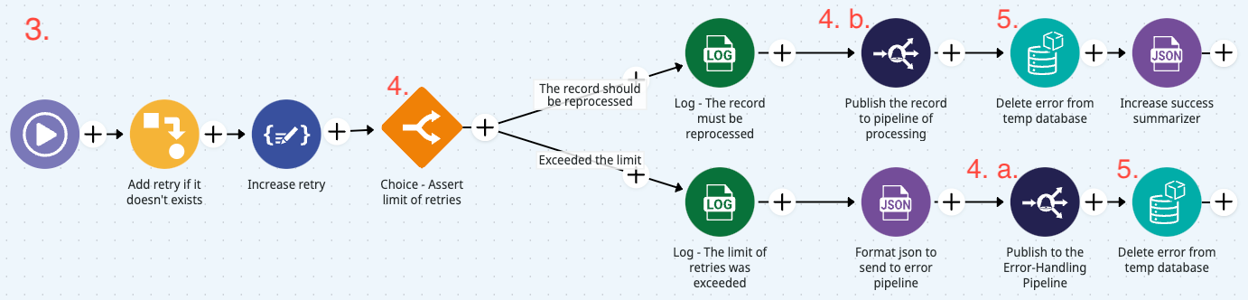 * **Record cannot be reprocessed:** If a record reaches the maximum retry limit, it’s sent to the error-handling pipeline for further treatment. It’s a good practice to specify the error and notify stakeholders about the maximum retries.