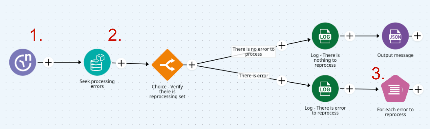 3. **Iterate query records**: A loop connector, such as [**For Each**](https://app.gitbook.com/s/EKM2LD3uNAckQgy1OUyZ/connectors/logic/for-each), to iterate through each retrieved record. Within the **OnProcess Subflow**, the first step is to increment the retry counter to track the number of reprocessing attempts for the record.