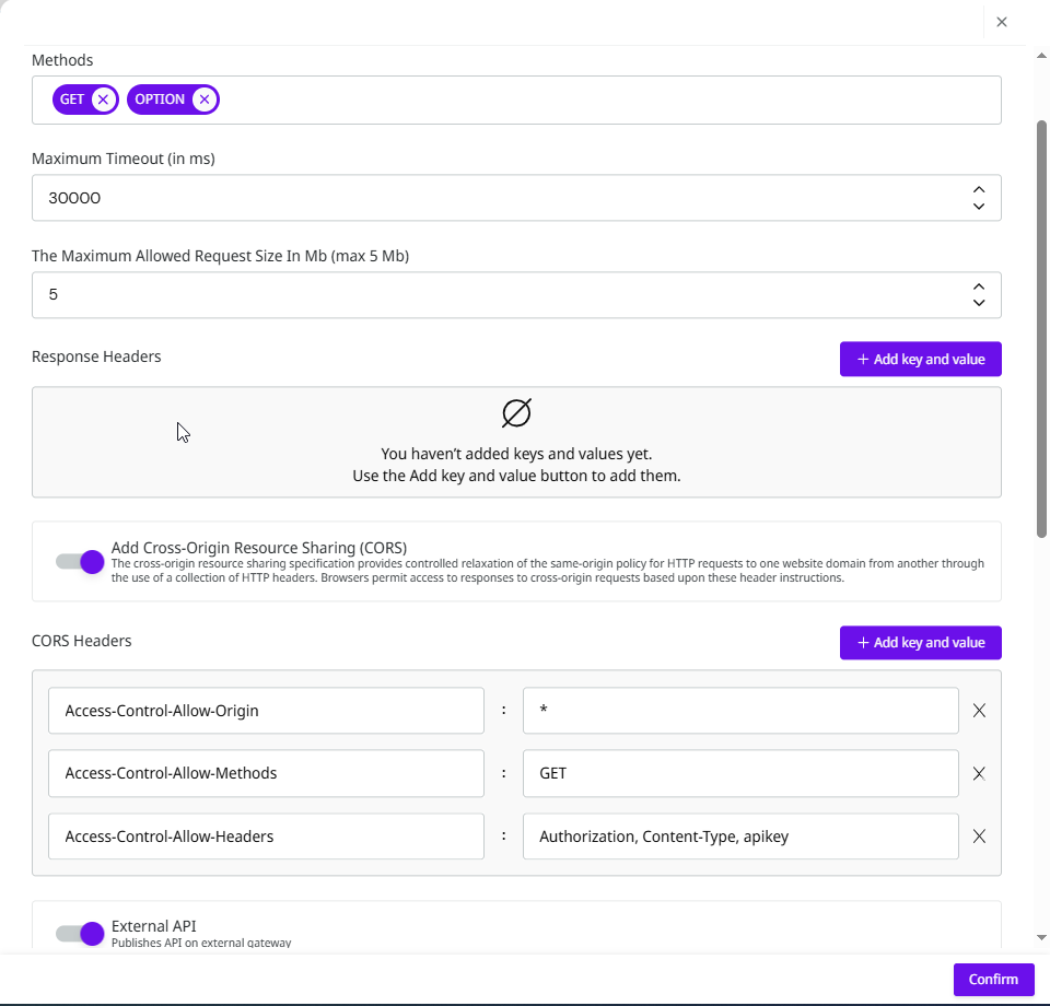GETandOPTIONSmethods.During setup, CORS is enabled and the CORS headers are defined as follows: