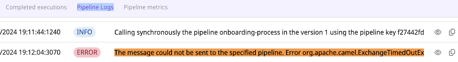 In this case, a desynchronization in communication between the two pipelines may occur, depending on the deployment configuration of both, especially when there is a high volume of executions. The destination pipeline returns a timeout error to the source pipeline, even if it’s executed in time.