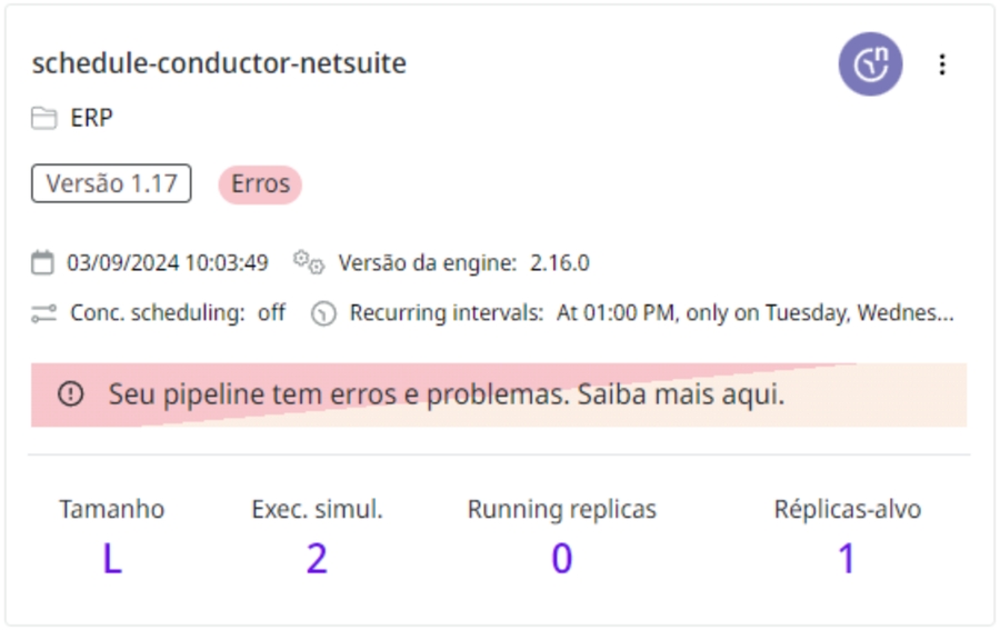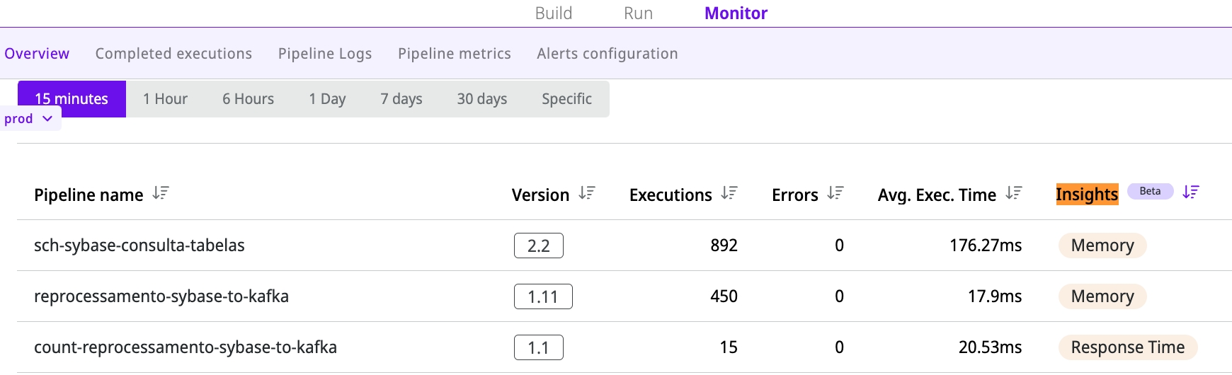 Monitor Insights: Este recurso oferece insights sobre a saúde das integrações concluídas. Selecionar um insight te direciona às métricas das execuções que exigem atenção, já filtradas pelo período de ocorrência. Mais informações estão disponíveis na documentação do Monitor Insights.