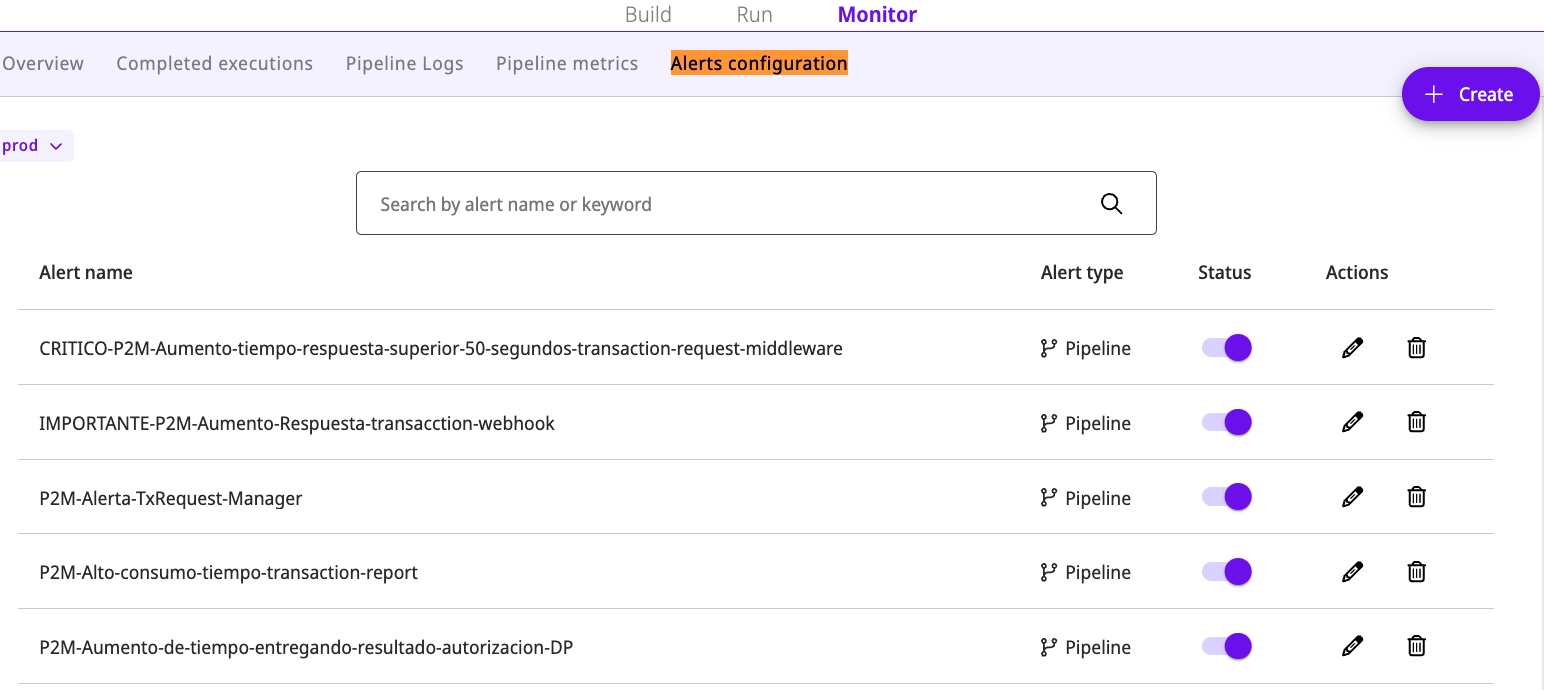 Configuração de alertas: Nesta página, é possível personalizar notificações de desempenho da integração com base em métricas, permitindo ações rápidas para minimizar impactos operacionais. Saiba mais na documentação de Alertas.