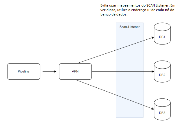 Ao conectar um pipeline a um banco de dados via VPN (Virtual Private Network), a topologia de rede impede a visibilidade dos nós por trás do Oracle SCAN Listener. Como consequência, o driver JDBC não consegue se conectar ao nó indicado pelo listener como disponível para receber a conexão.
