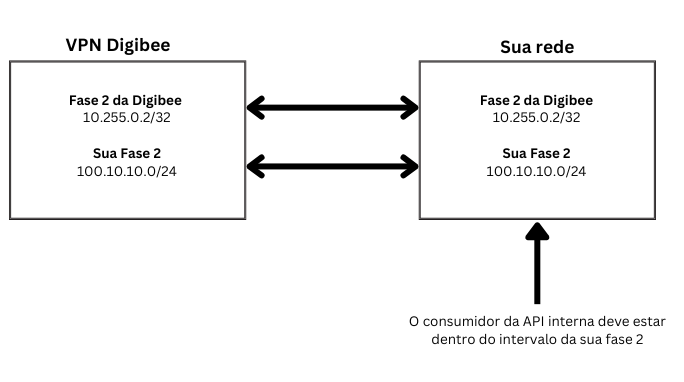Para consumir um endpoint por meio de uma VPN, certifique-se de que a **Fase 2 da Digibee** está devidamente configurada na sua rede. O serviço que faz a requisição deve estar dentro da faixa de IPs mapeada para a Fase 2 da Digibee.