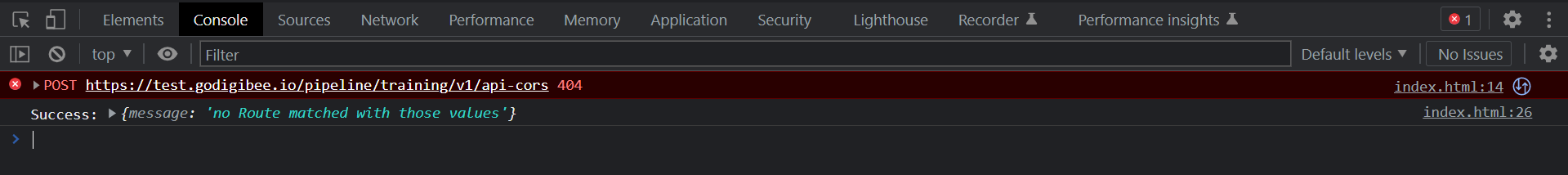 Neste exemplo os headers estão de acordo com a política CORS, porém o método `POST` utilizado pela chamada no navegador não está configurado no trigger. Isso vai gerar um erro **404 Not found**.