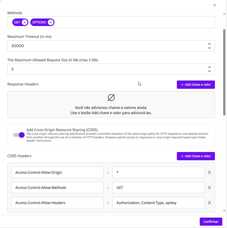 * **Access-Control-Allow-Headers** para aceitar requisições que possam conter apenas os headers `Authorization`, `Content-Type` e `apikey`.