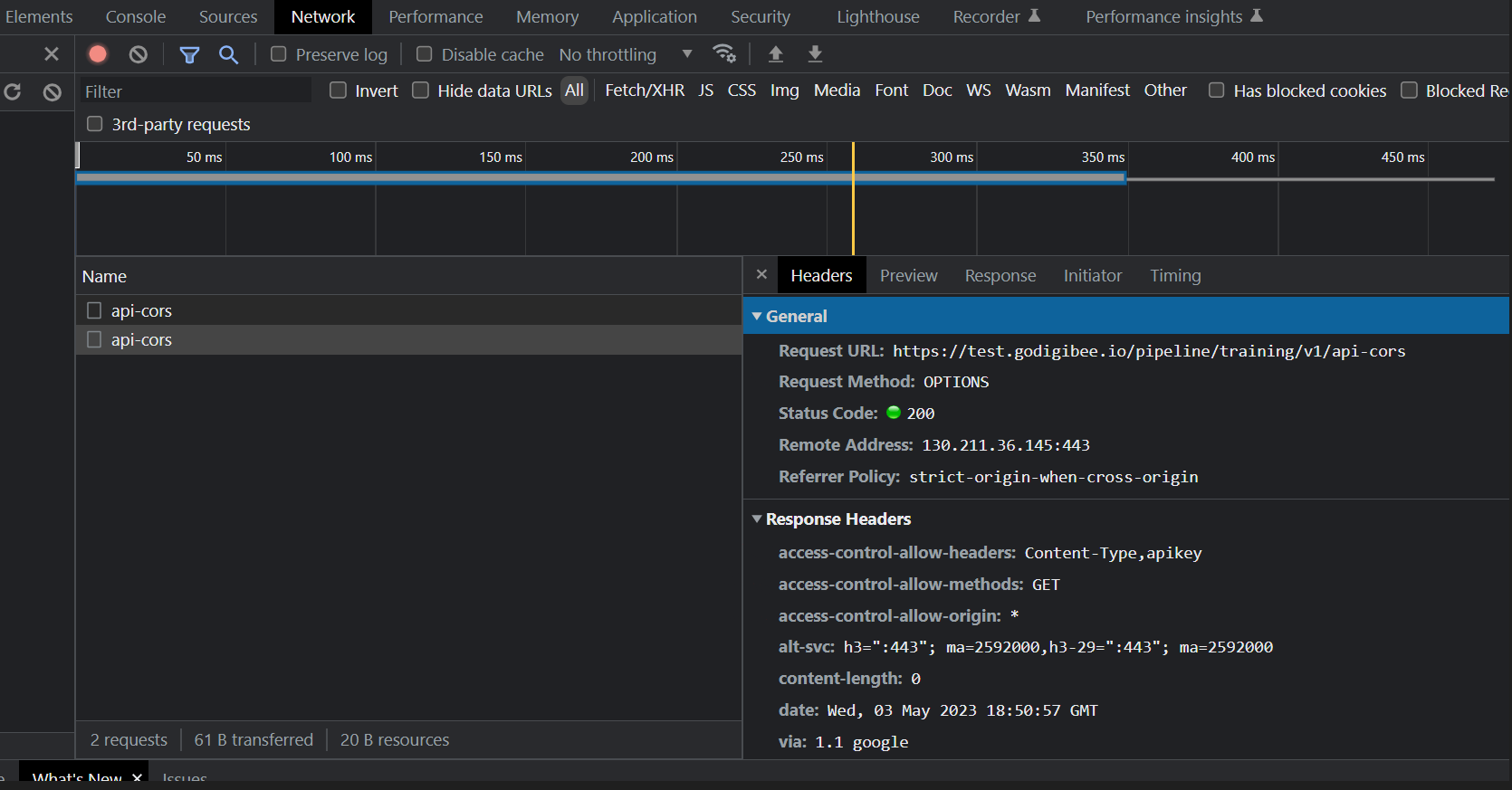 O navegador faz o **Preflight** para o endpoint da Digibee utilizando o método `OPTIONS`, que retorna os headers CORS. Como a requisição atende a política CORS configurada no trigger do pipeline, você está autorizado a seguir com a requisição `GET`.
